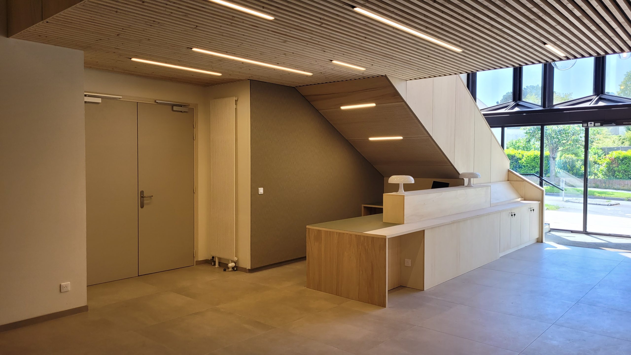 Un élément clé de cette rénovation réside dans l’intégration d’une cloison en tissu tendu acoustique de la marque TEMPO, positionnée stratégiquement derrière la borne d’accueil. Cette solution innovante apporte une touche esthétique chaleureuse et améliore significativement l’acoustique de la zone d’accueil.