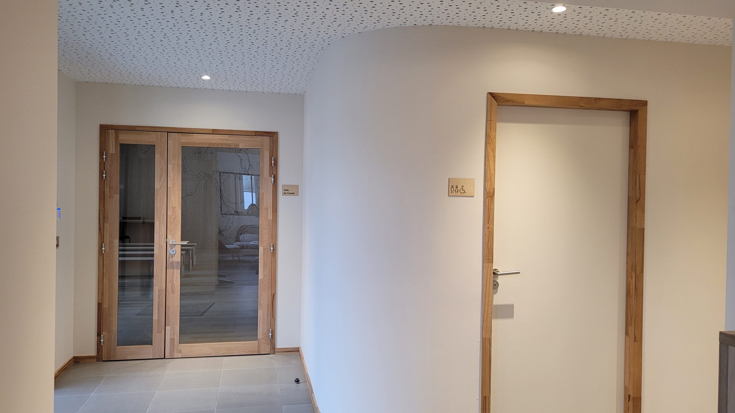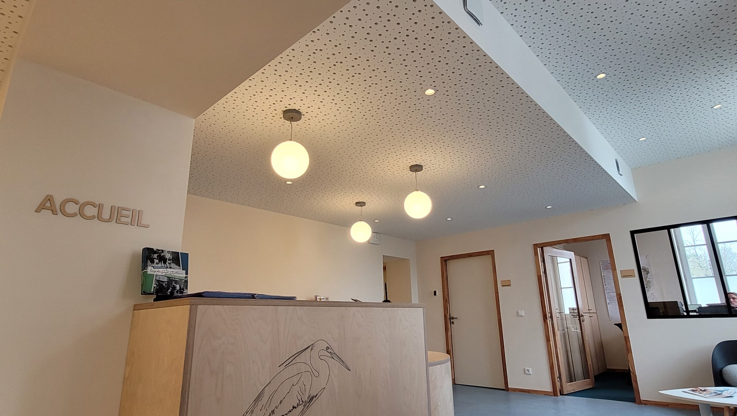 - Plafond de la salle de cérémonie en Createx 8-15-20 de Siniat France, choisi pour ses qualités acoustiques et son design raffiné.